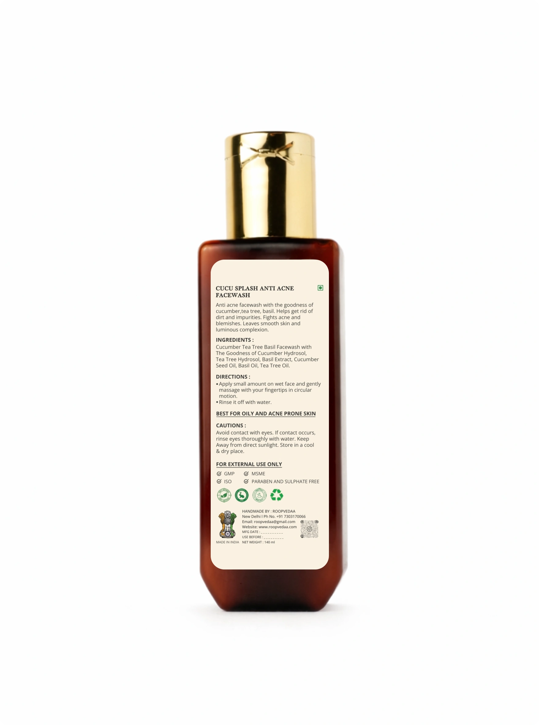 Cucumber Tea Tree Basil Facewash with Tea Goodness of Cucumber Hydrosol, Tea Tree Hydrosol, Basil Extract, Cucumber Seed Oil, Basil Oil, Tea Tree Oil Charcoal.