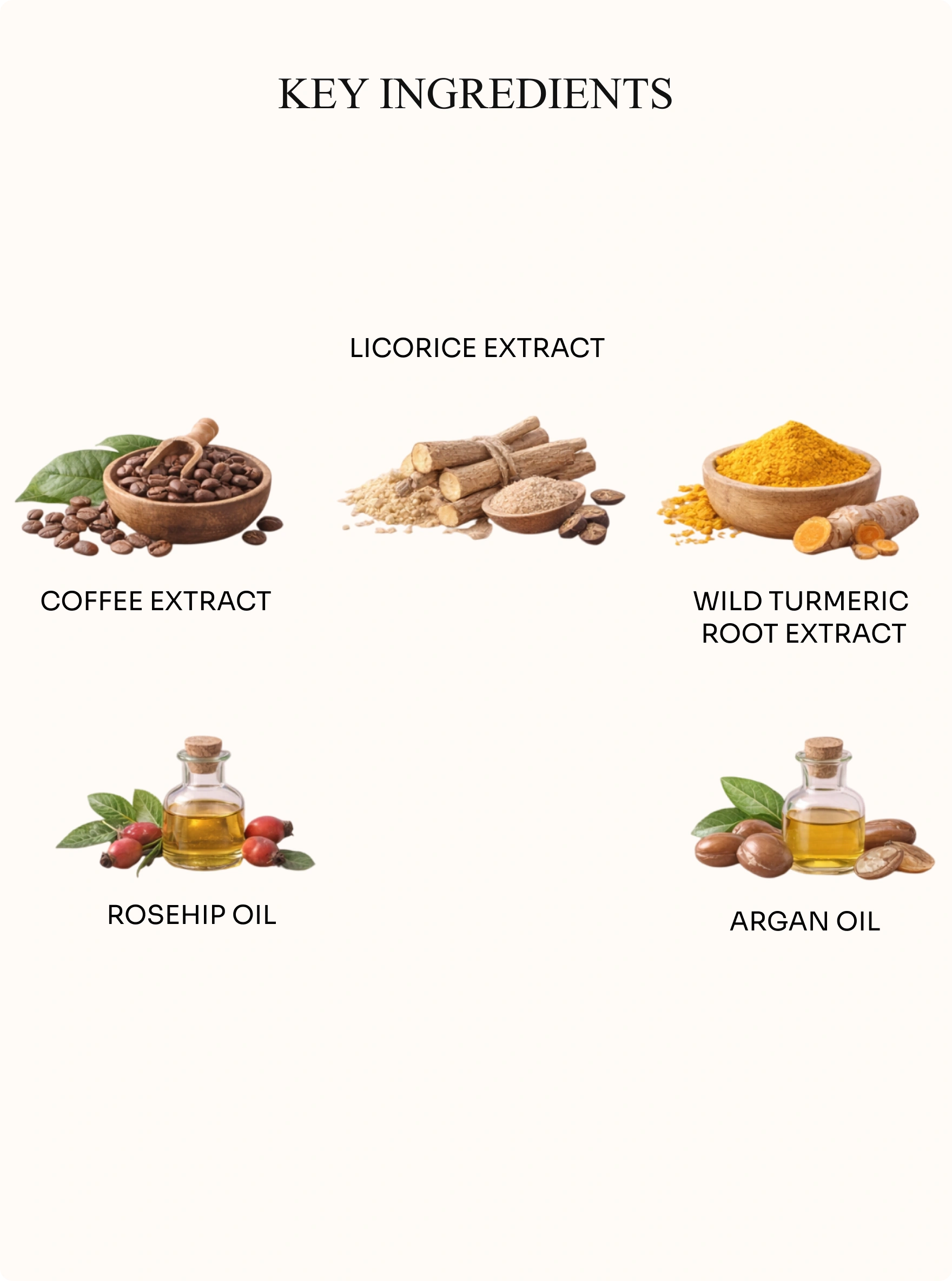 Coffee extract, vanilla bean oil, coffee beans oil, coffee hydrosol, licorice extract, lavender, wild turmeric root extract, rosehip oil, argan oil, SPF 30, Gotu kola, Sandalwood, Almond Oil, Jojoba Oil.
