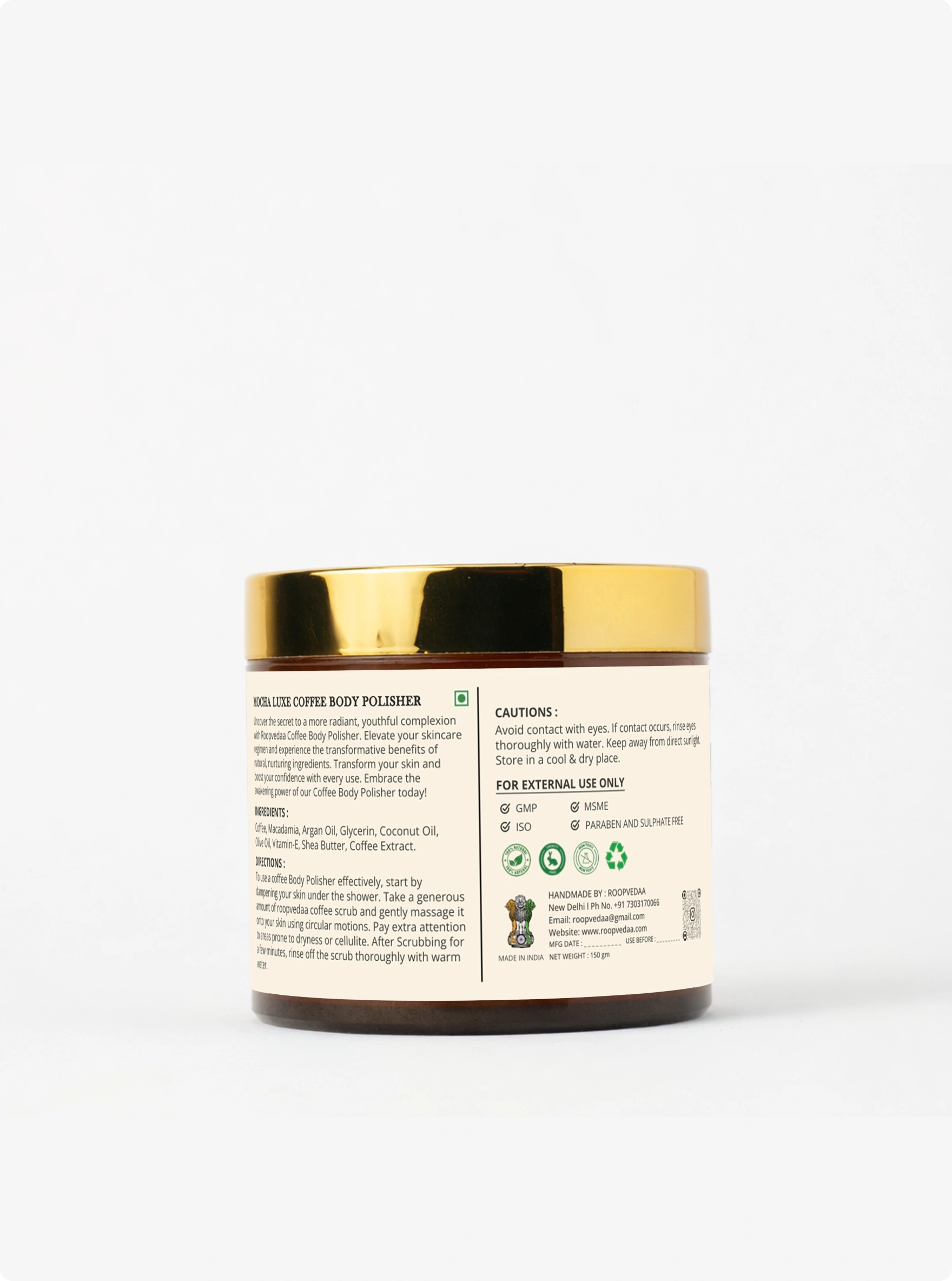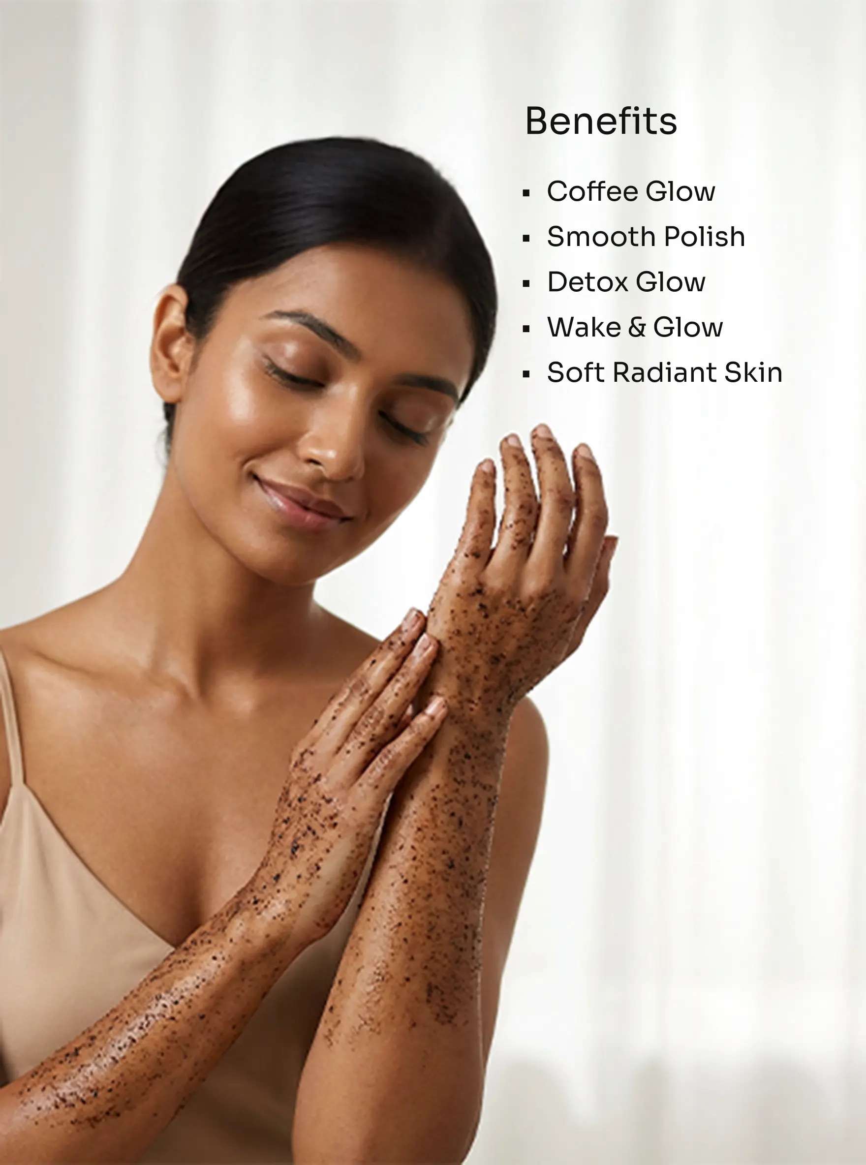 - Take a generous amount of the Coffee Body Polisher and apply it to damp skin.