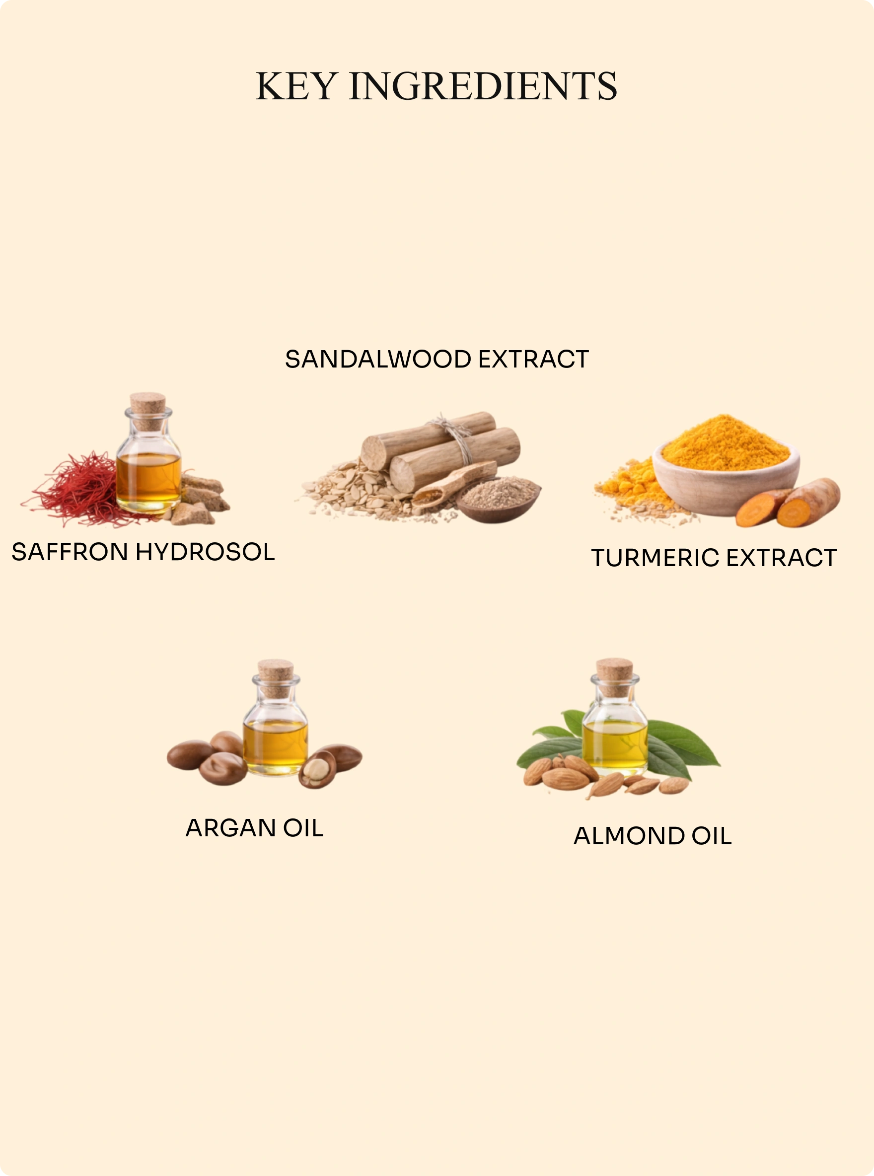 Saffron hydrosol, sandalwood hydrosol, saffron extract, sandalwood extract, turmeric extract, kumkumadi oil, Alovera Extract, Licorice Extract.