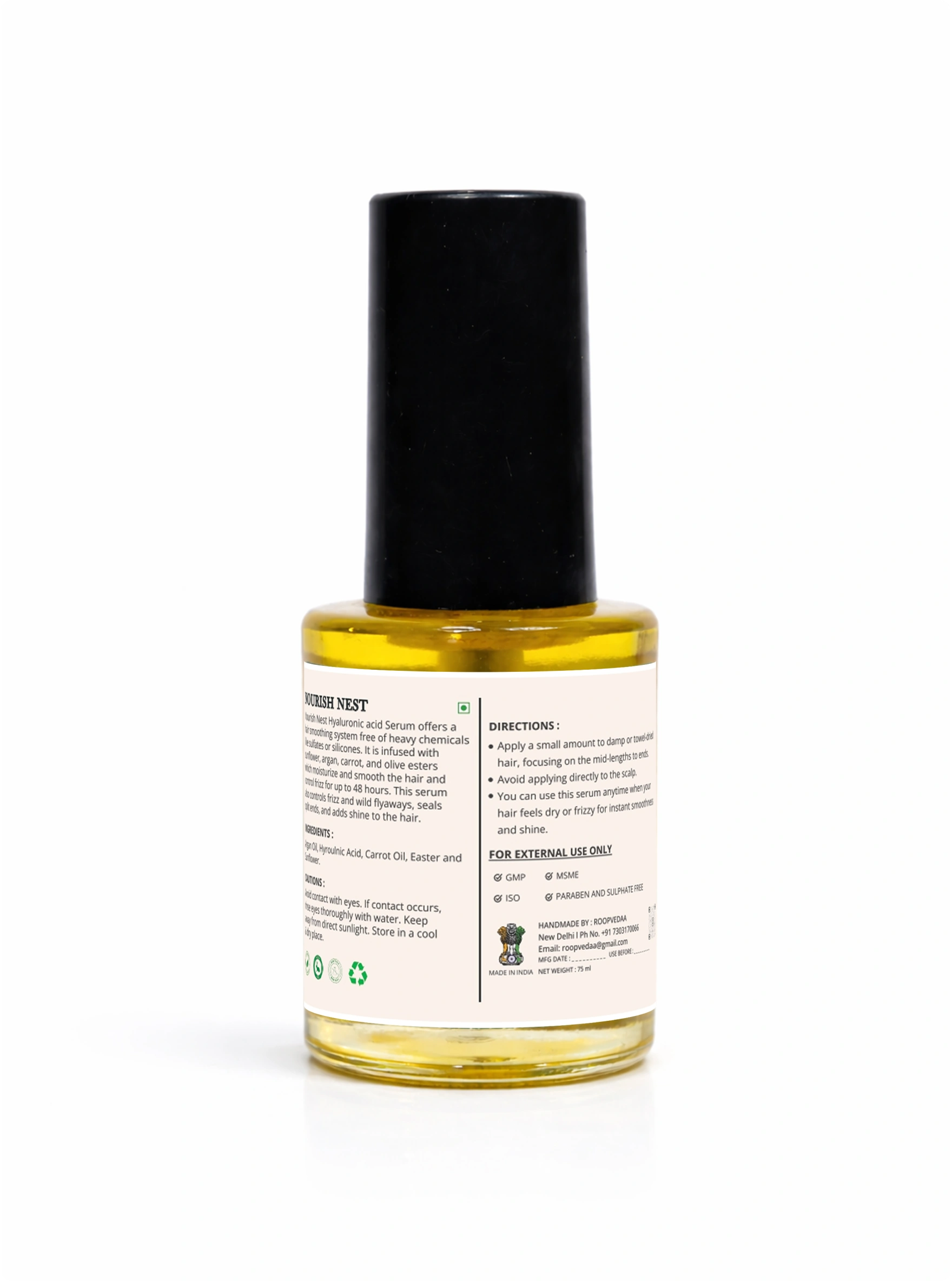 Nourish Nest Hair Serum is a lightweight, non-sticky styling serum designed to smooth frizz, tame flyways, and enhance natural shine. Formulated without heavy silicones or harsh chemicals, this serum nourishes the hair while improving manageability, leaving strands soft, glossy, and well-conditioned without weighing them down.