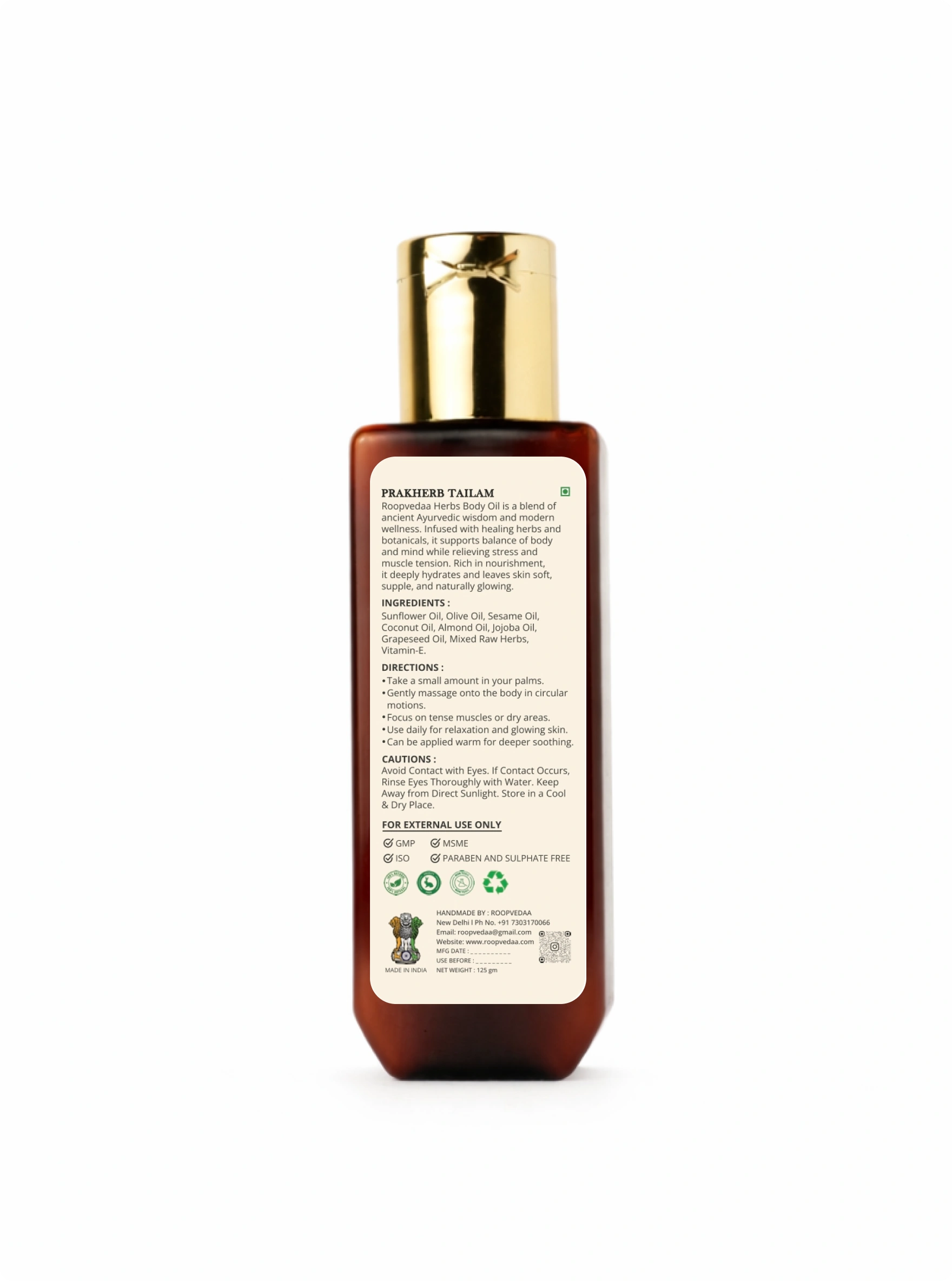 Prakherb Tailam Experience the harmonious blend of ancient Ayurvedic wisdom and modern wellness with our Ayurvedic Massage Oil. Derived from time-tested formulations, it offers a holistic approach to relaxation and rejuvenation.