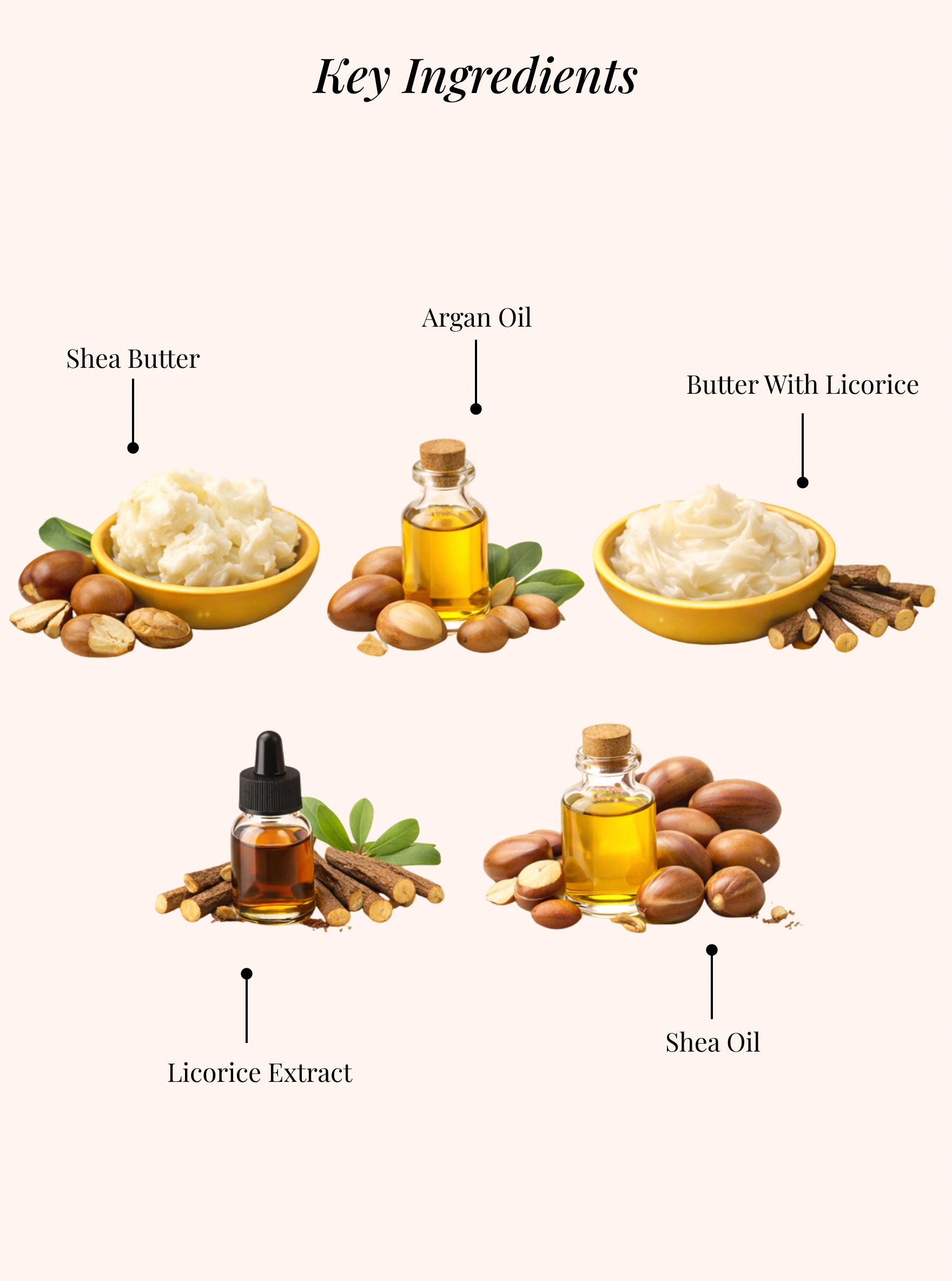 Shea Butter, Argan Oil, Licorice Extract, Shea Oil, Natural Plant Oils