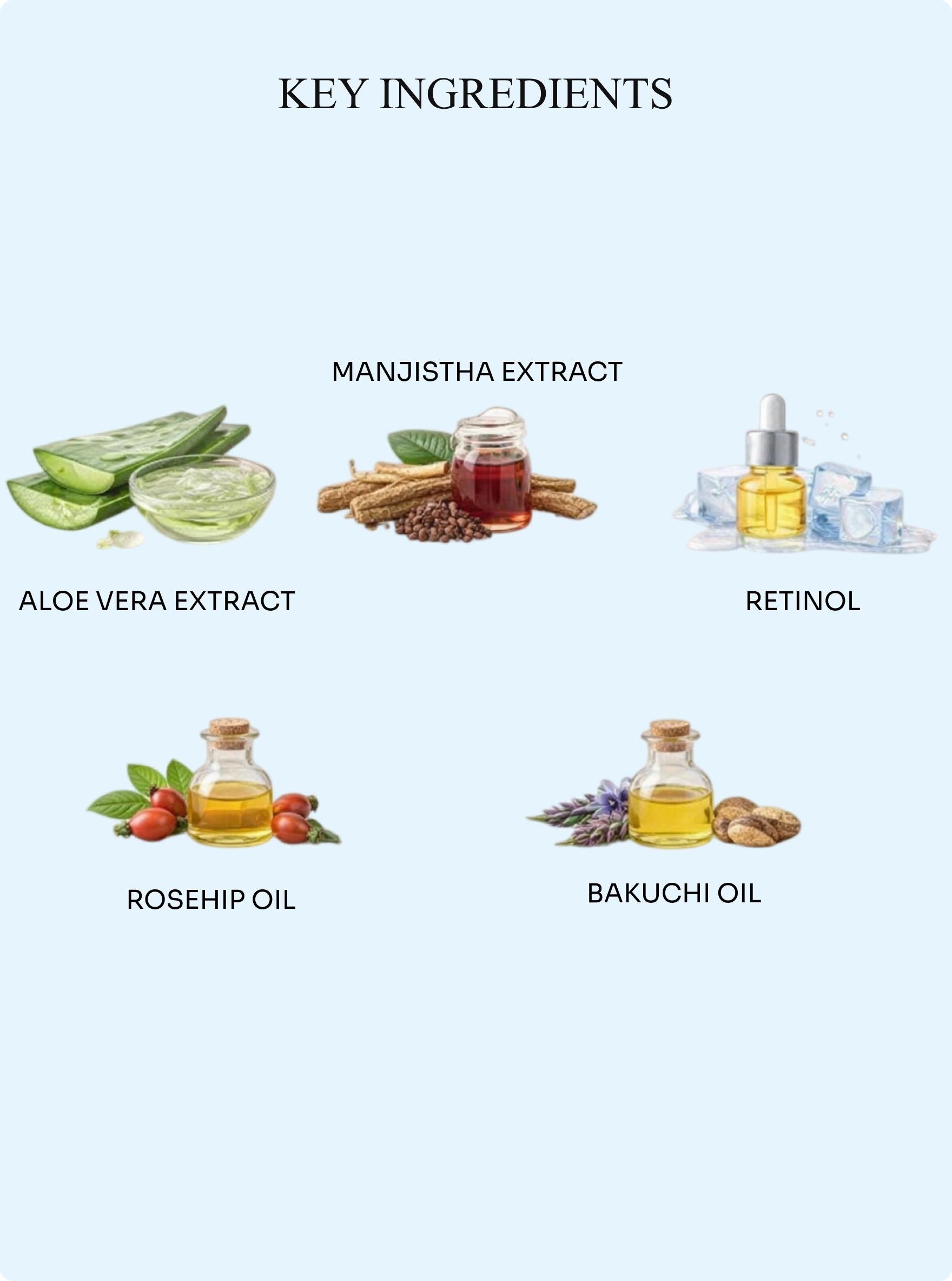 Aloe vera extract, rose hydrosol, manjistha hydrosol, manjistha extract, retinol ( Plant Derived ), kojic acid, geranium oil, rosehip oil, argan oil, and bakuchi oil, Sandalwood, Gotu Kola.
