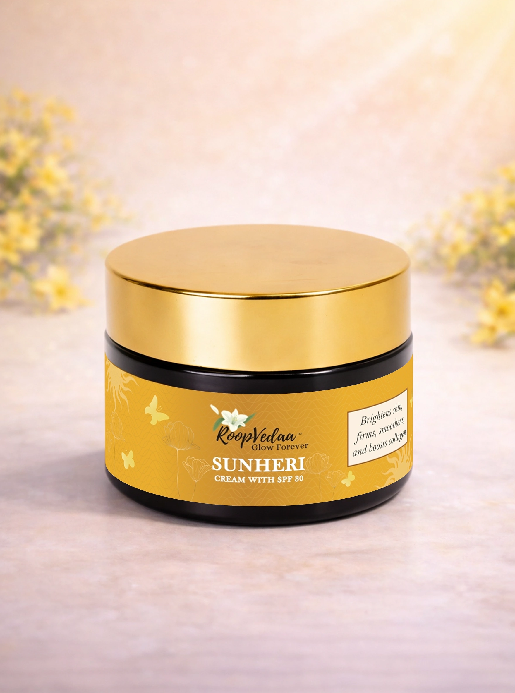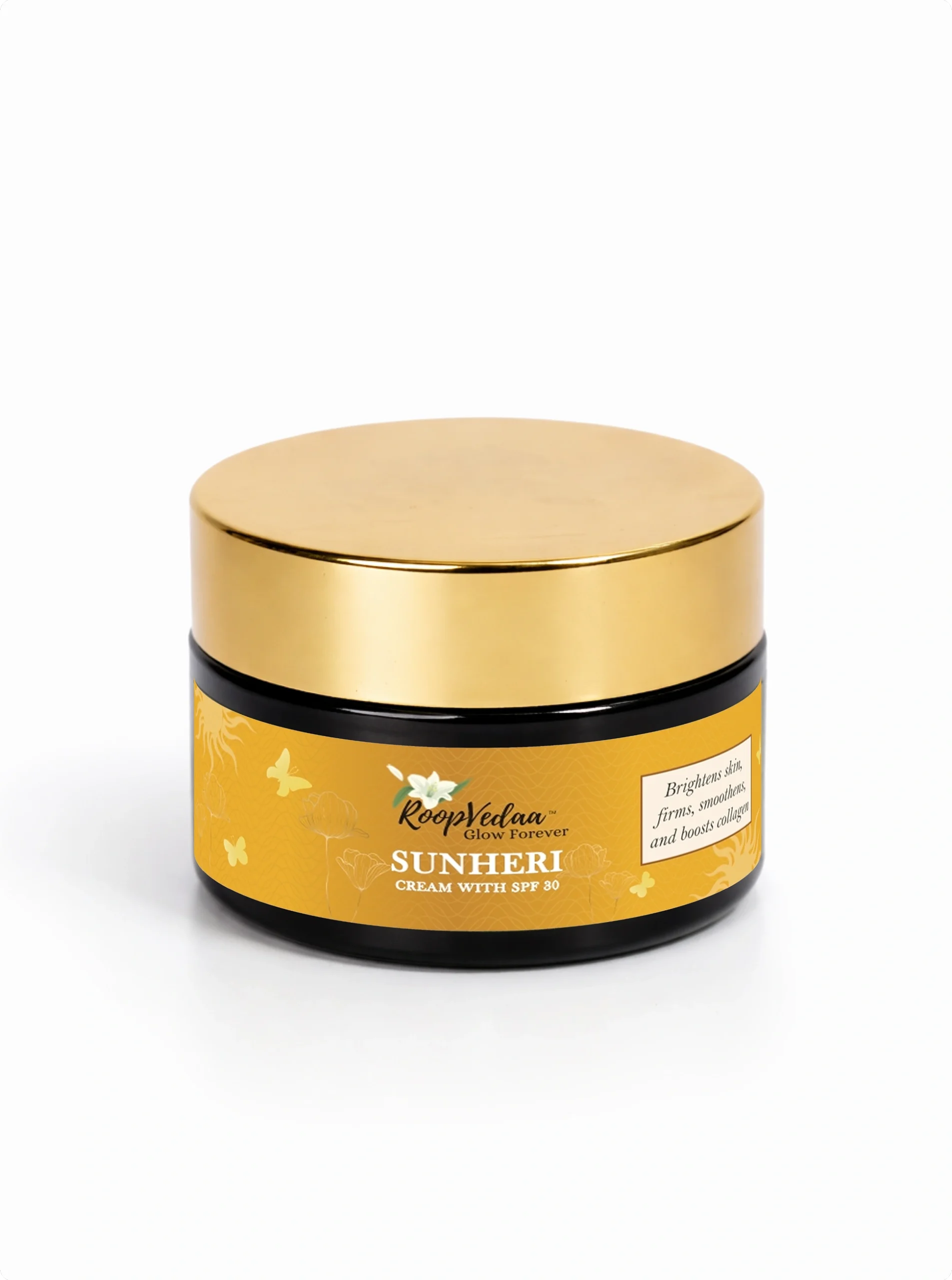 Sunheri Cream Illuminate and protect your skin with this indulgent Sunheri Cream Enriched with pure gold flakes and plant-derived botanicals, it deeply nourishes, firms, and restores radiance while broad-spectrum SPF shields against UVA/UVB damage. Lightweight yet powerful, it hydrates, smooths fine lines, and leaves skin luminous, youthful, and glowing throughout the day—your daily ritual of luxury and protection.