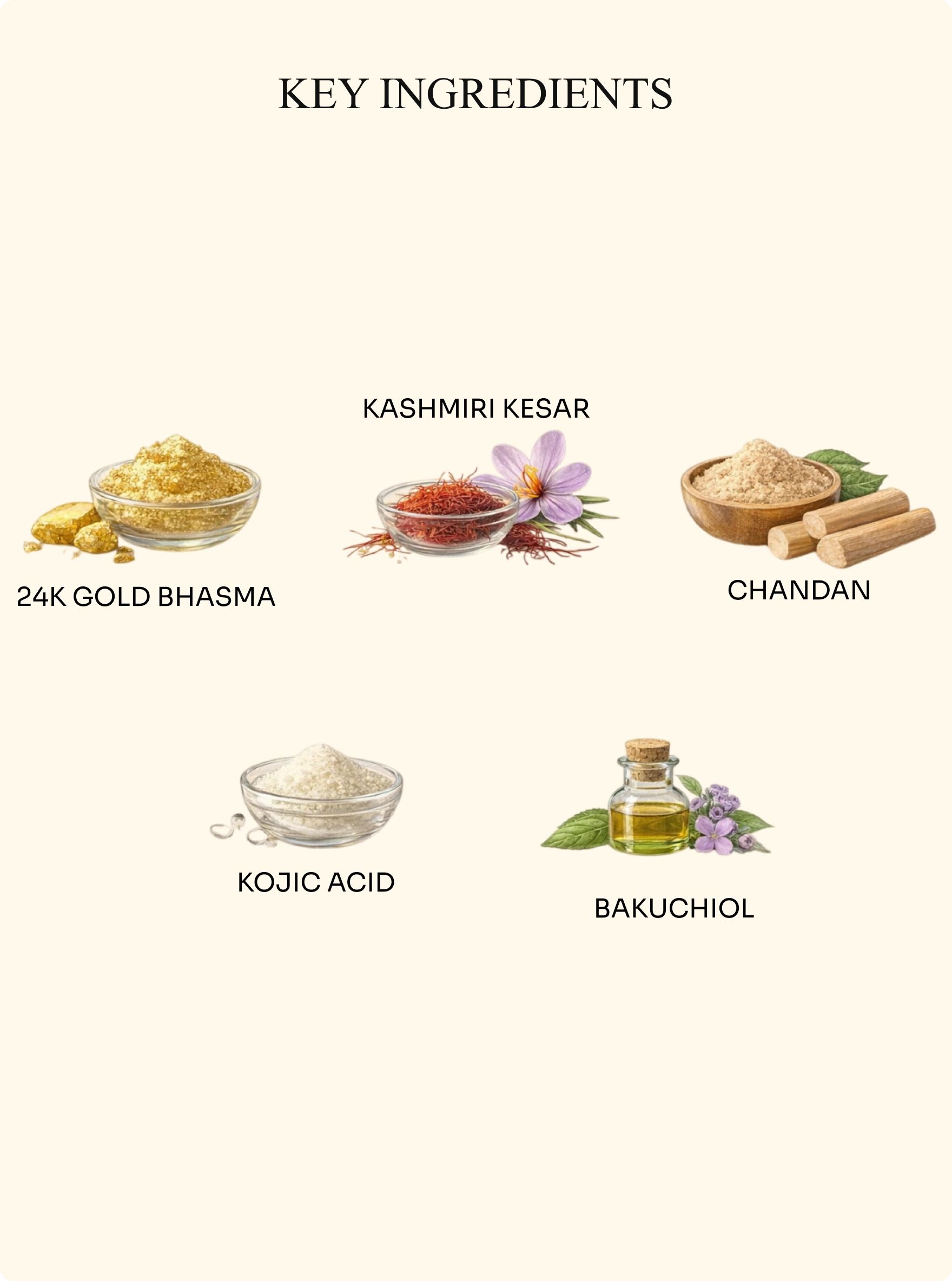 24k Gold Bhasma, Kashmiri Kesar, Chandan, Majistha, Kojic Acid, Plant Extracts, Vitamin C, Bakuchiol, Avocado Butter, Gold Flakes, Kashmiri Kesar, Avocado Butter, Jojoba Oil.