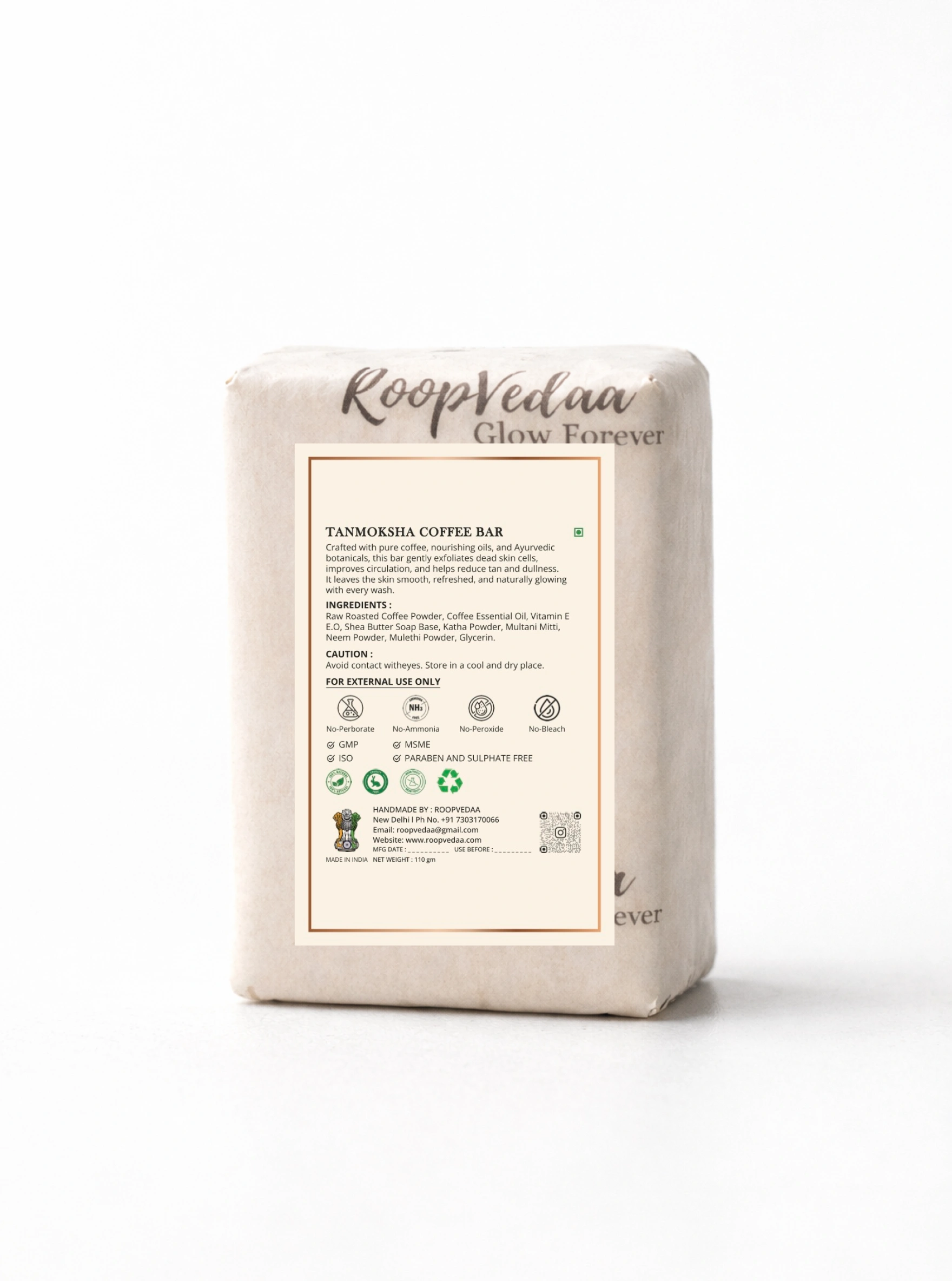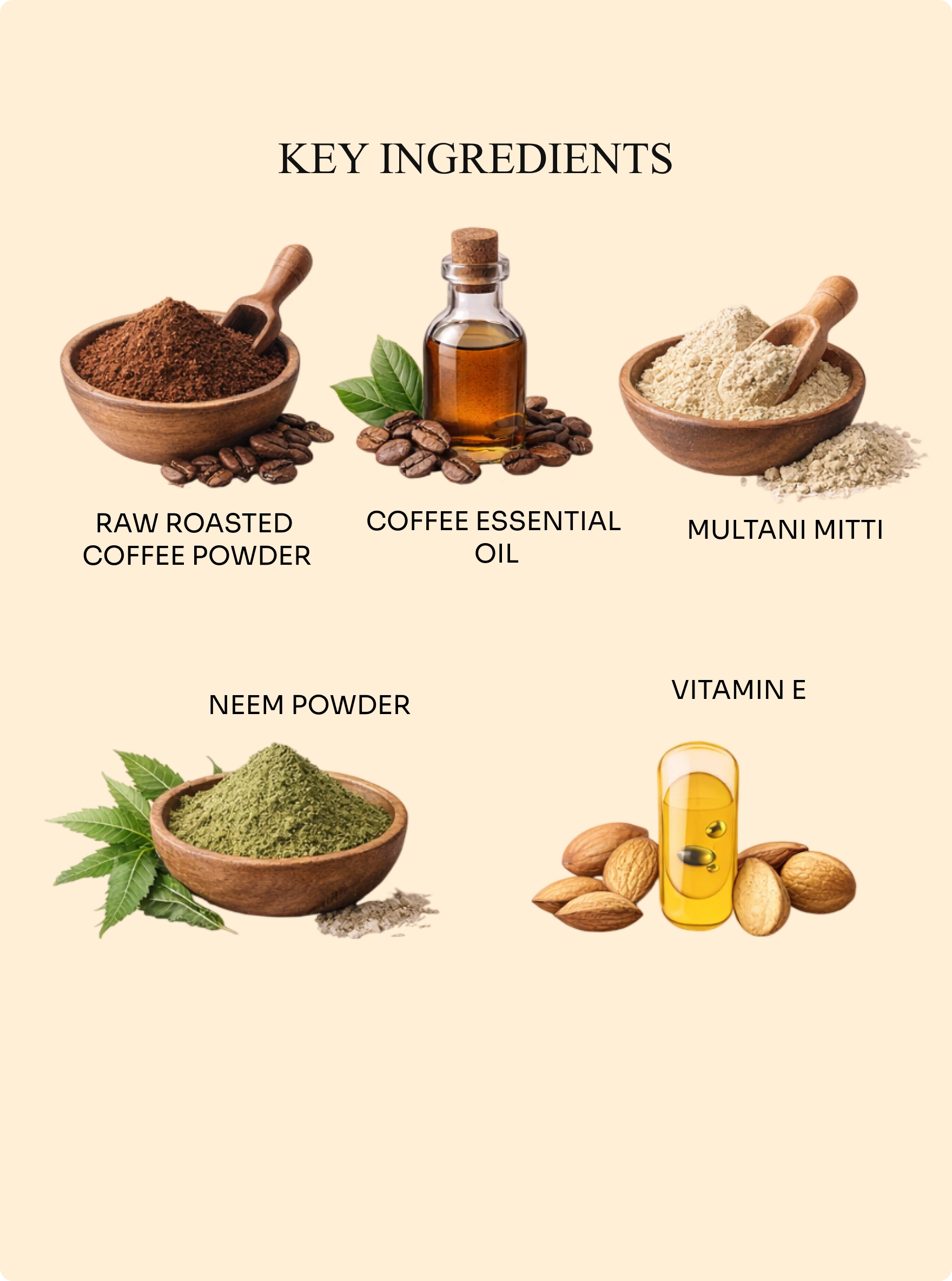 Raw Roasted Coffee Powder, Coffee Essential Oil, Vitamin E Essential Oil, Shea Butter Soap Base, Katha Powder, Multani Mitti, Neem Powder, Mulethi Powder, Glycerin.